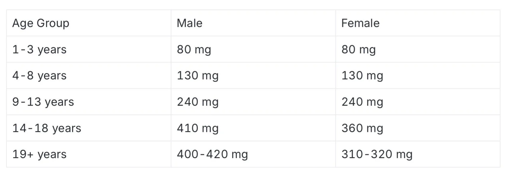 The Recommended Dietary Allowance (RDA) for magnesium varies by age and gender: